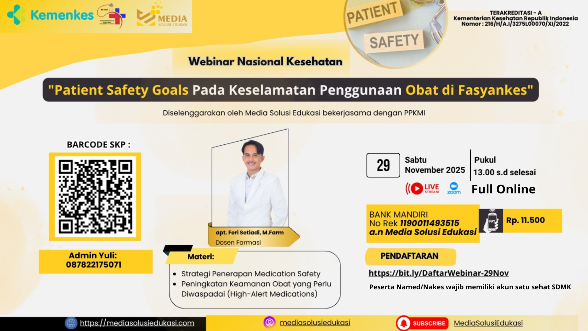 Keselamatan pasien (patient safety) merupakan prioritas utama dalam penyelenggaraan pelayanan kesehatan yang bermutu. Salah satu aspek penting dalam keselamatan pasien adalah keselamatan penggunaan obat (medication safety), karena obat merupakan intervensi medis yang paling banyak digunakan dalam penanganan pasien. Menurut WHO, kejadian terkait obat (medication errors) merupakan salah satu penyebab insiden keselamatan pasien yang paling sering terjadi di fasilitas pelayanan kesehatan. Kesalahan ini dapat terjadi pada berbagai tahap, mulai dari peresepan, transkripsi, penyediaan, hingga pemberian obat kepada pasien. Dampaknya tidak hanya menurunkan mutu pelayanan, tetapi juga dapat mengakibatkan kecacatan, memperpanjang masa rawat inap, bahkan kematian. Di Indonesia, penerapan Patient Safety Goals telah menempatkan “meningkatkan keamanan obat yang perlu diwaspadai” sebagai salah satu sasaran utama. Hal ini mencerminkan urgensi dalam mencegah kesalahan penggunaan obat, terutama pada obat-obat high alert medications (seperti insulin, antikoagulan, kemoterapi) serta LASA (Look Alike Sound Alike). Namun, di lapangan masih banyak tantangan: • Kurangnya kepatuhan terhadap standar prosedur pemberian obat. • Komunikasi antar tenaga kesehatan yang belum optimal. • Edukasi pasien dan keluarga yang masih terbatas terkait penggunaan obat. • Keterbatasan sistem pencatatan elektronik atau barcode medication administration di beberapa fasilitas kesehatan. Melihat pentingnya isu ini, maka diperlukan peningkatan pemahaman dan kompetensi tenaga kesehatan mengenai “Patient Safety Goals Pada Keselamatan Penggunaan Obat di Fayankes” sebagai bagian dari sasaran keselamatan pasien. Webinar ini diharapkan dapat menjadi sarana edukasi, berbagi pengalaman, serta mendorong budaya keselamatan pasien melalui penggunaan obat yang aman, efektif, dan bertanggung jawab di fasilitas pelayanan kesehatan.